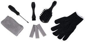 Continut - Setul de curatare contine 1x carpa din microfibra, 1x tampon abraziv, 2x perii de curatare, 1x surubelnita si o pereche de manusi.