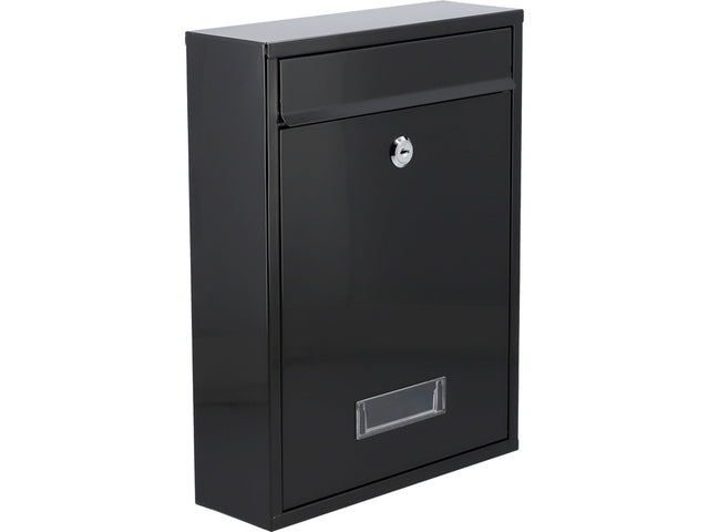 Cutie postala 360x260x80mm. Fabricat din tablă de oțel grosime de 0,6 mm, zincata, culoare negru. Cutia are o deschidere în partea superioară cu un capac de protecție. Partea frontală are un panou din plastic cu posibilitatea de a plasa o placă de identificare cu adresa sau numele. Setul include 2 chei. Partea din spate are găuri de montaj. Greutate netă 1.73kg