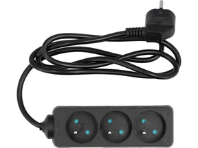Klasszikus hosszabbító kábel 3 földelt aljzattal - francia típusú. H05VV-F 3G1,0 mm2 kábel. 1,5 méter hosszú. Műanyag ház. Fekete szín.