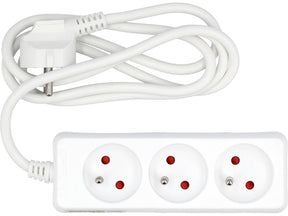 3 aljzatú hosszabbító kábel, földeléssel. Műanyag ház. Hossz 1,5 m. Fehér. H05VV-F 2G kábel 1.00mm2, 10A