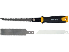 Kézi fűrész három cserélhető pengével. A pengék további szerszámok használata nélkül cserélhetők. Két részből készült fogantyú. Precíziós munkákhoz és modellezéshez ajánlott.