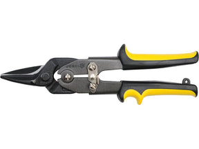 Lemezvágó olló, nikkel-krómacélból, 54-58 HRC keménységűre edzett. Feketedett felület. Két színű, ergonomikus műanyag lemezekkel borított fogantyúk. Biztonsági zárral felszerelt a pofák rögzítéséhez. Akár 1,2 mm vastag acéllemezek vágásához.