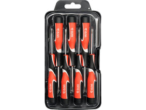 Set șurubelnițe de precizie, cu vârful magnetic, lucru ce facilitează lucrul cu șuruburi mici. Surubelnitele sunt realizate din otel S2 cu duritatea 57-61HRC. Mâner realizat în tehnologie cu trei componente, completată cu un capac rotativ care facilitează și accelerează înșurubarea.